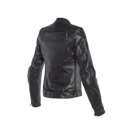 Dainese Nikita Lady Leather Jacket. Elegance and femininity but also sportiness and character define this jacket conceived for the most demanding bikers. Made in Cowhide with elastic inserts, removable composite protectors in shoulders and elbows and predisposition for Type G1 back protector (not Air Shield). With a 3D Bubble lining, air inlets in sleeves and leather fretwork areas. Completing this jacket: regulation of the width of the sides, Jacket-Trouser connecting zip, reflective appliqués for better visibility when driving at night or under poor light and various pockets (3 exterior and 1 interior).