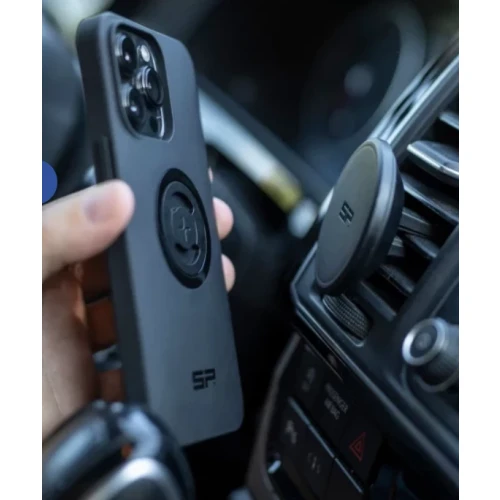 Monteres i ventilasjonsdyser i bilen. Telefonen festes til braketten ved hjelp av det integrerte magnetfestet på SPC+ Phone Case.