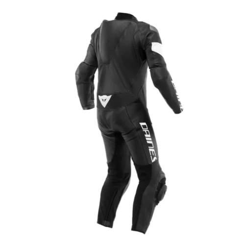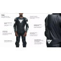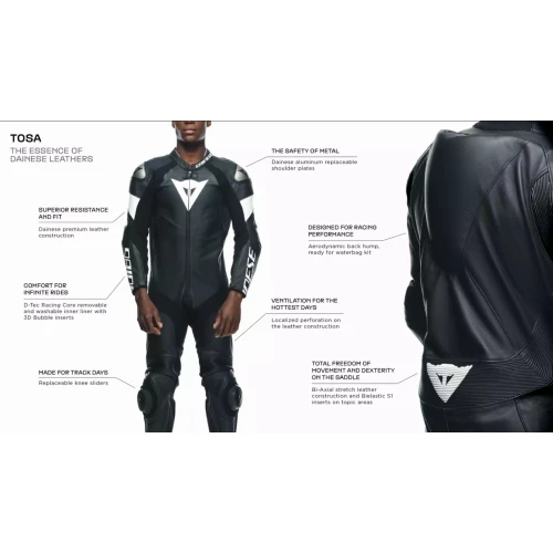 Dainese Tosa one-piece motorcycle suit with CE EN 17092 certification made of premium perforated Tutu cowhide for optimized temperature on hot days. The classic Dainese fit is slim and fitted, while at the same time providing great freedom of movement due to the S1 elastic fabric inserts on the inner arm, groin, and back leg areas. The biaxial stretch fabric inserts on the back, as well as the stretch patches on the knees and shoulder blades, are designed to simultaneously guarantee that all skin is protected, in addition to maximum flexibility and freedom of movement. The special protection system combines Dainese’s classic internal protectors with removable sliders on the knees and interchangeable aluminum plates on the shoulders: A distinctive Dainese technology designed to support and facilitate sliding in case of a fall, thus preventing the dangerous risks of rolling caused by grip on asphalt. The aerodynamic hump is designed to accommodate the water bag, which can be connected to the helmet. It is placed at the shoulders and neck to protect the upper back, performing a function complementary to the back protector.
